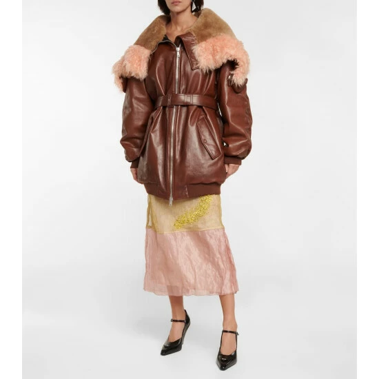 In an insulating and distinct blouson silhouette, this coat from Prada embodies the brand’s cutting-edge approach to outerwear. Made from weighty lamb leather, the belted design has an oversized collar with contrasting shearling and mohair trims and a two-way zipper for versatile styling.