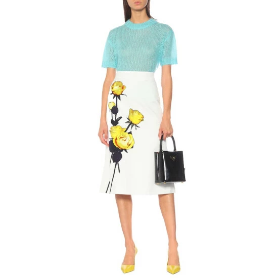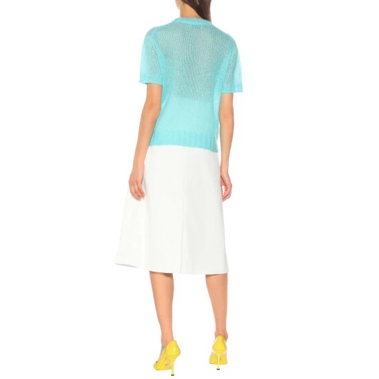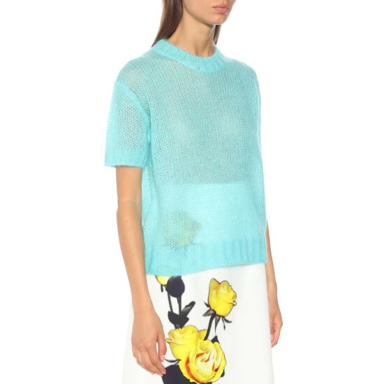 Prada’s bright blue T-shirt has been crafted in Italy from fuzzy mohair-blend yarns. The loose knit of the piece means it has a semi-sheer finish, so try yours over a lining tank or camisole.