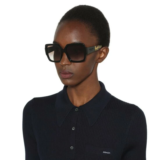 These oversized square sunglasses are from Prada’s Monochrome collection, distinguished by the tonal logo lettering at the temples. Made in Italy from black acetate with brown tortoiseshell arms, they have gradient brown lenses that offer 100% UVA/UVB protection. A year-round style, they’ll shield your eyes from the winter sun and high-summer rays alike.