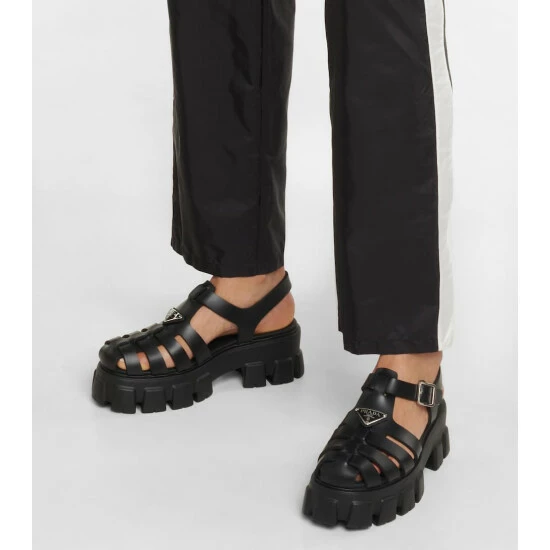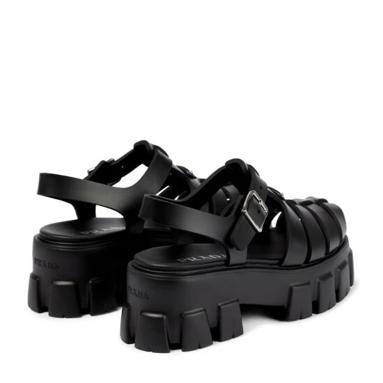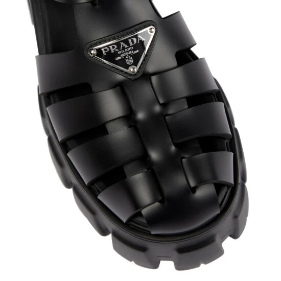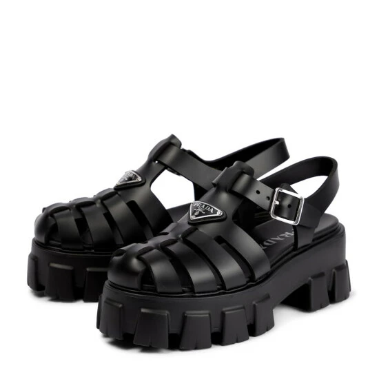 These platform sandals from Prada are slated to become the latest footwear-favorite from the brand. Designed with the iconic Monolith rubber sole, they have cage-like straps that are finished with an enameled logo plaque.