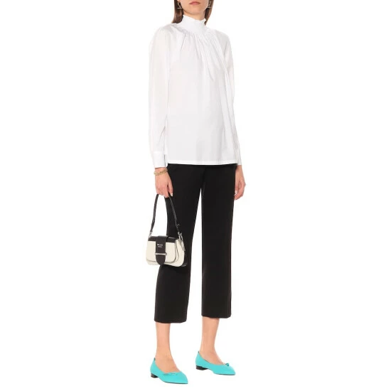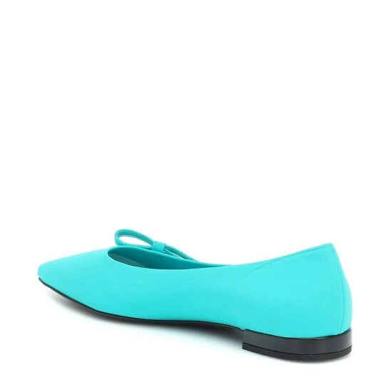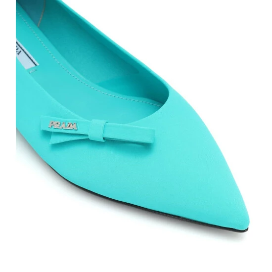 Tap Prada’s future-facing approach to fabrication with these turquoise blue ballet flats. Crafted in Italy from neoprene, they’re cut to a point-toe silhouette with charming bow-embellishment featuring the house logo in silver-tone metal letters.