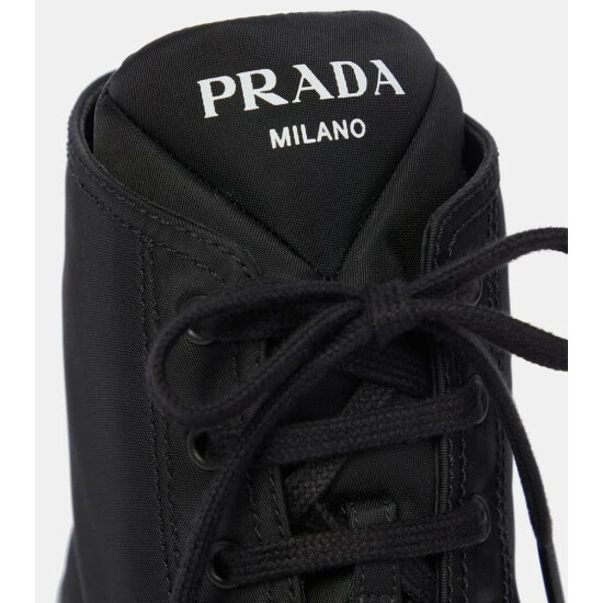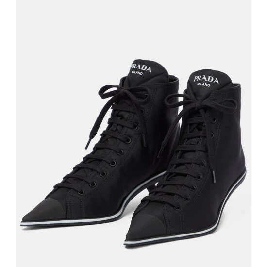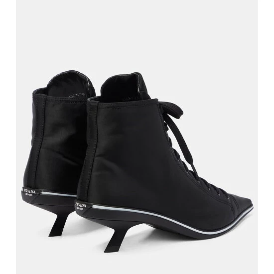 Prada’s playful side shines through with these sneaker-inspired black ankle boots. Made in Italy from nylon gabardine, the piercing point-toe pair has white stripes framing the soles and perches atop slanted kitten heels. Style with a nylon swing skirt from the Spring/Summer 2021 collection.