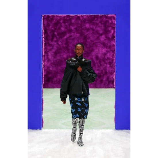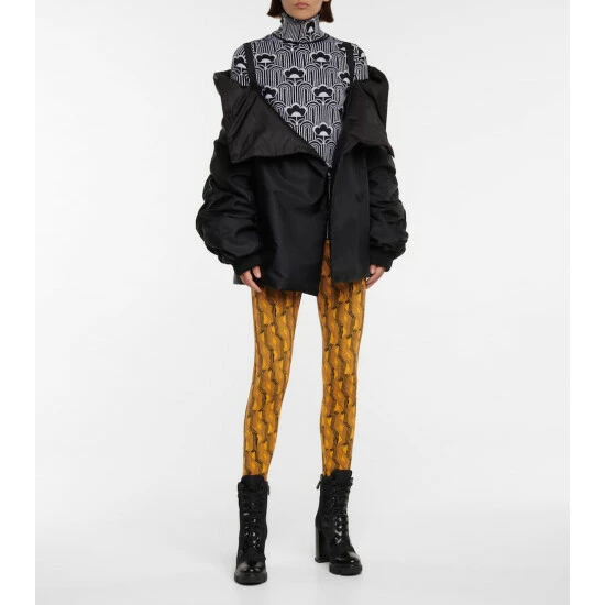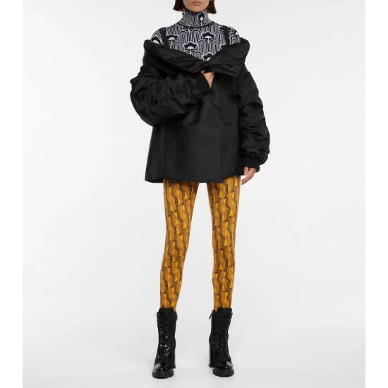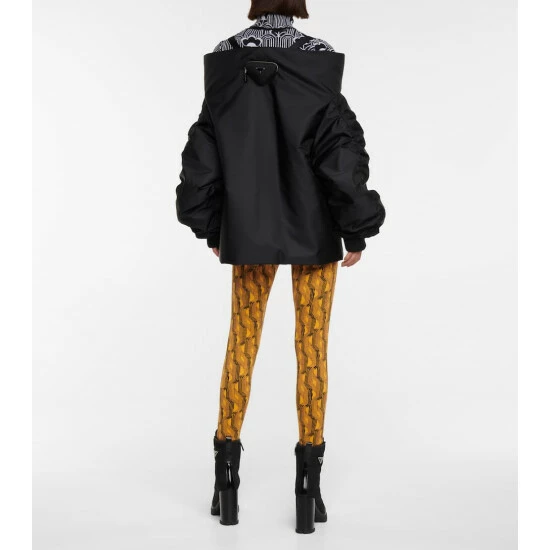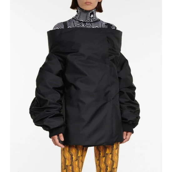 This black off-the-shoulder jacket debuted at Prada’s Fall/Winter ’21 runway show. Made in Italy from the brand’s signature nylon that’s padded for insulation, it has an oversized silhouette with extra-long sleeves that have knit cuffs.