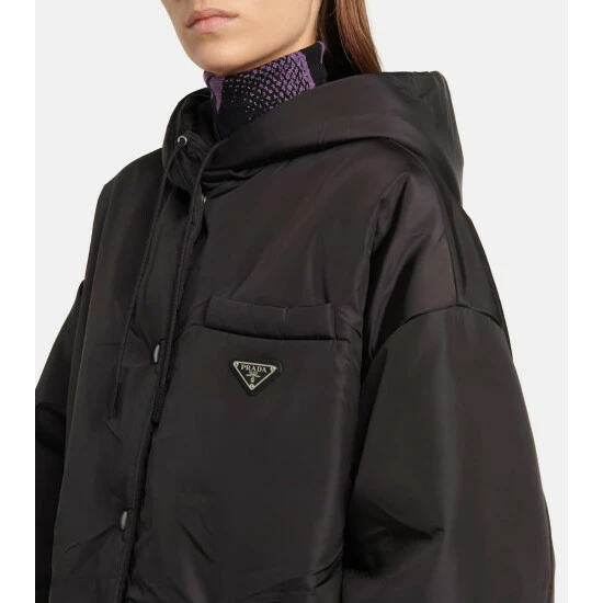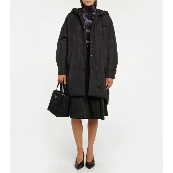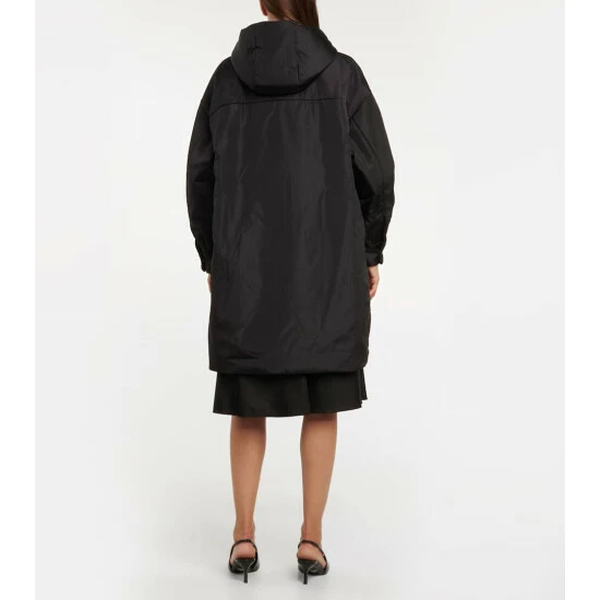 Prada presents this black raincoat in its enduring fabrication of choice: technical, lightweight nylon. This calf-length design features a drawstring-adjustable hood, a trio of welt pockets, popper fastenings and, naturally, the triangular logo plaque on the chest. Consider it an especially chic means of warding off the elements.