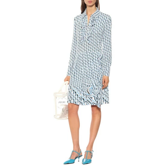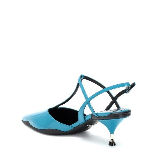 These vibrant pumps from Prada showcase the brand’s signature technical finish in the form of a black rubber sole which arches around the upper and, with an embossed logo, trims the back of the heel. The Italian-made pair begin with pointed toes and finish with stamped metal kitten heels. Complement the colorway by wearing yours with a sky-blue dress.