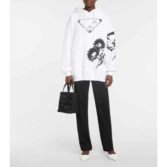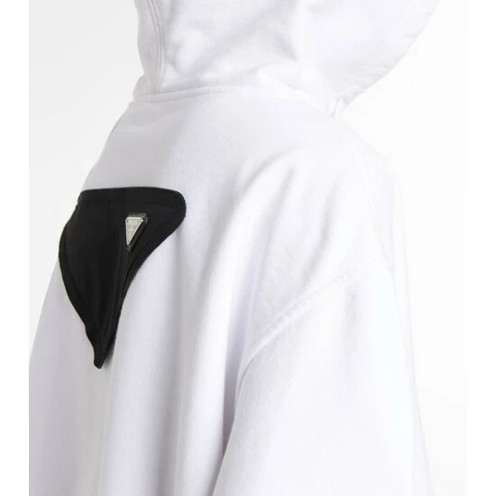For his first Prada collection, Raf Simons rejoined forces with one of his past collaborators, Peter de Potter, to create boldly printed pieces like this hoodie. This oversized white style, stamped with the house’s triangle branding in contrasting black, is made from comfortable cotton jersey fleece.