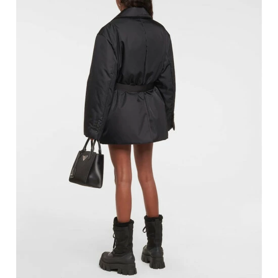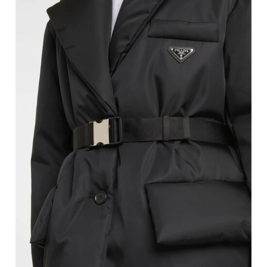 Fashion meets function in this Prada jacket, which is crafted from sustainable Re-Nylon and padded with a warm down feather-blend. It has an oversized fit and features an adjustable buckled belt, large pockets, and the label’s signature triangle emblem at the chest.