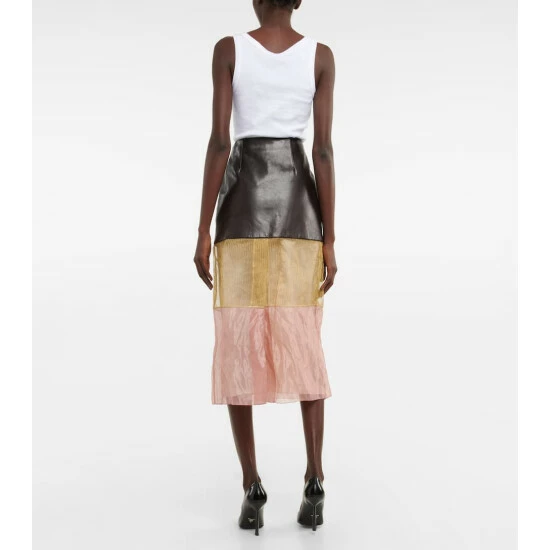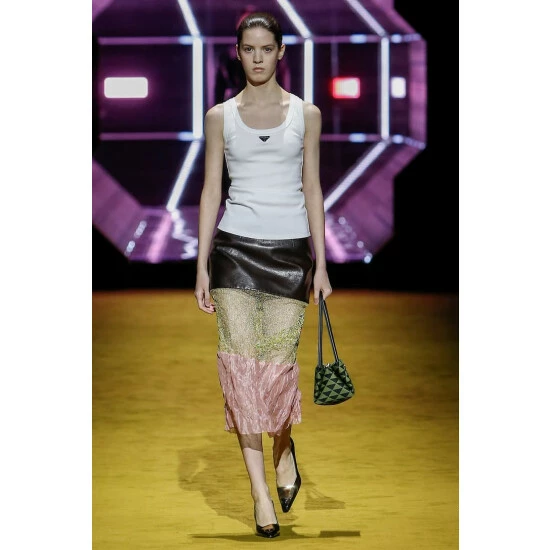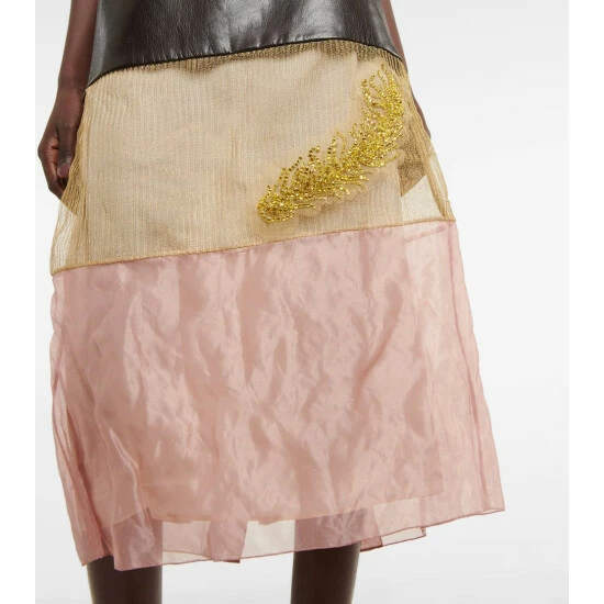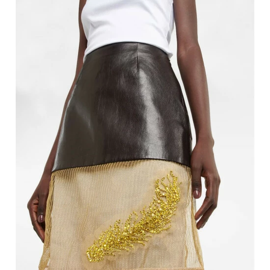 This striking patchwork midi skirt was unveiled at Prada’s Fall/Winter 2022, which focused on telling stories through garments. The style is constructed with three different materials, including leather and mesh featuring an embroidered feather.