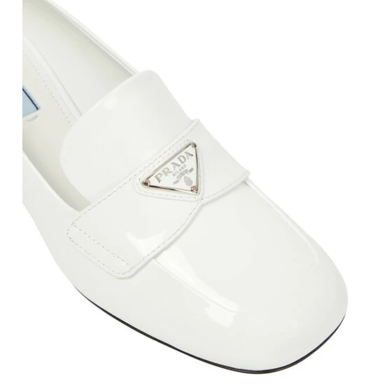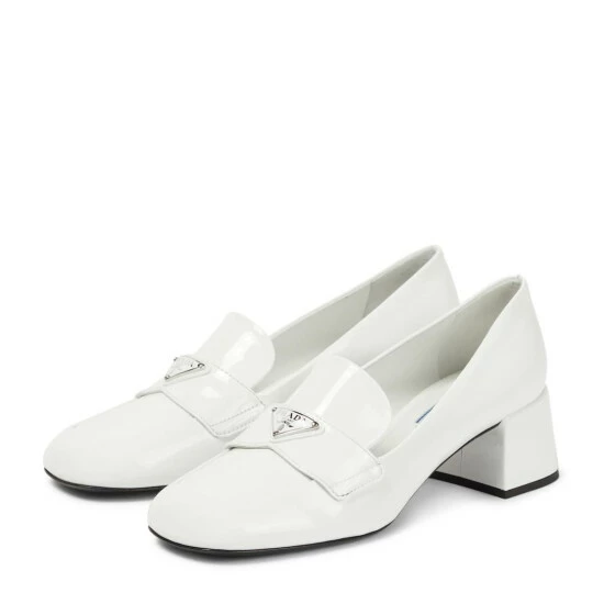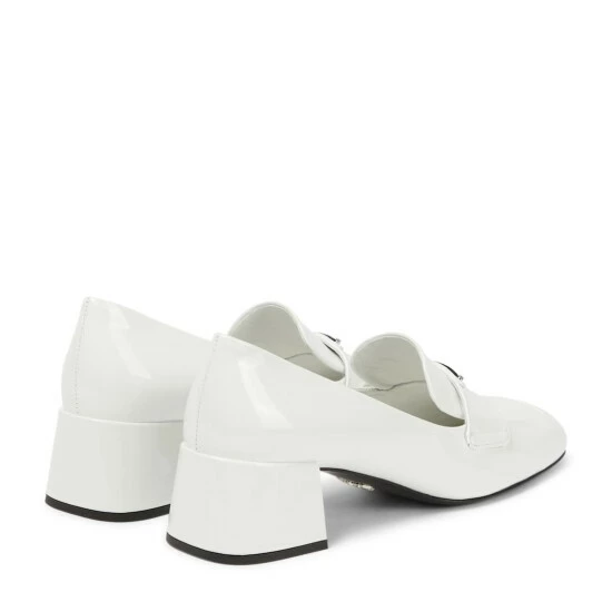 Prada reinterprets the classic loafer silhouette with these high-shine pumps. Made from white patent leather, the elegant style is finished with the brand’s iconic triangle logo plaque at the front.