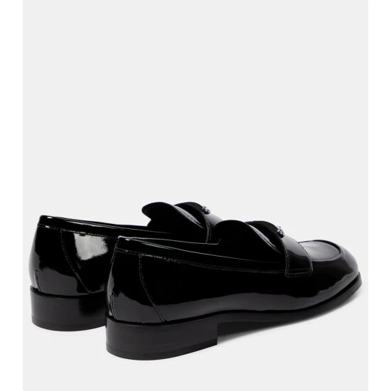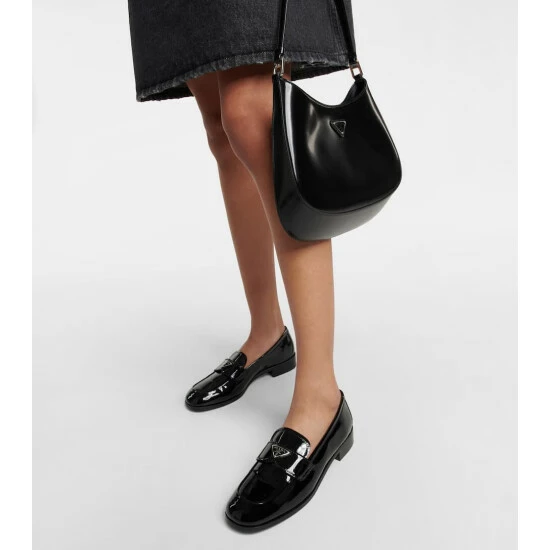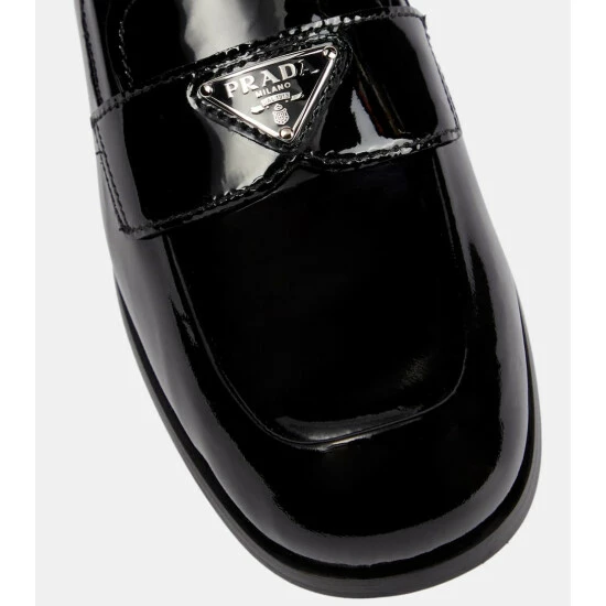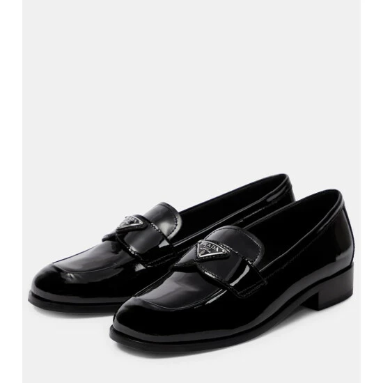 Prada adds an androgynous touch to your shoe edit with these loafers. The glossy patent leather pair have triangular logo plaques at the saddle straps.