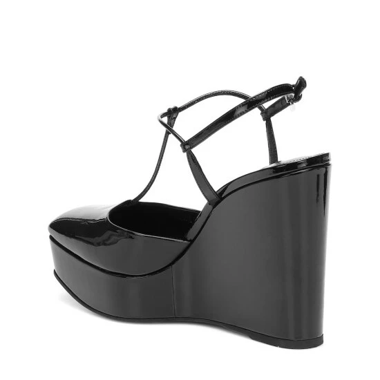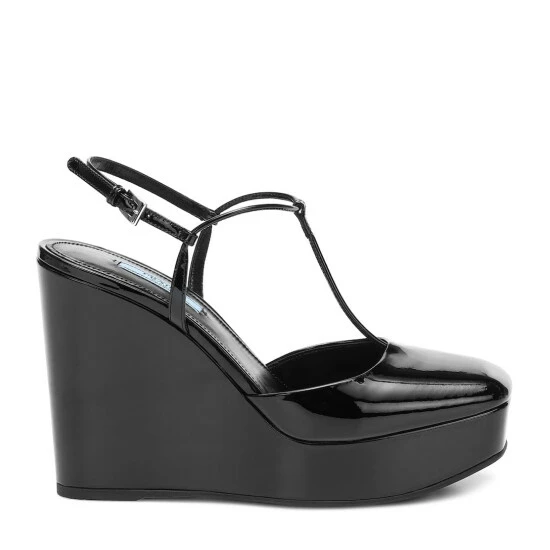 A high-shine patent leather fabrication and towering platform wedges are the power duo that make these pumps from Prada instant head-turners. The pair is made in Italy and, for endless styling opportunities, comes in classic black.