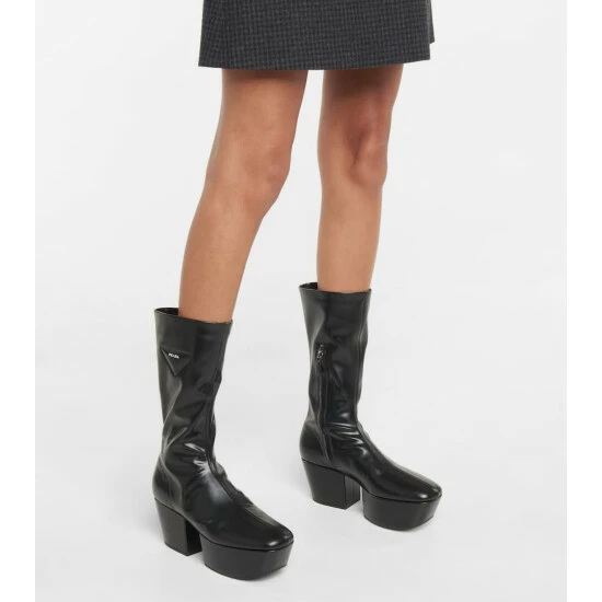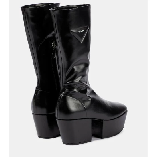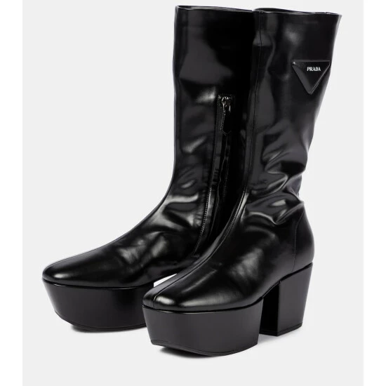 These polished black Prada ankle boots are inspired by the sleek lines of ’70s architecture. First shown on the Fall ’21 runway, they have sleek, streamlined shafts and split platform soles – both of which are covered in technical faux nappa leather.