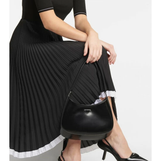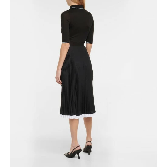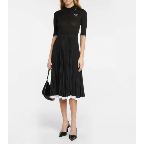 Update your dress edit with this sports-luxe midi dress from Prada. It has a finely-knitted polo top with a contrasting pleated crêpe de chine skirt that allows for free movement.