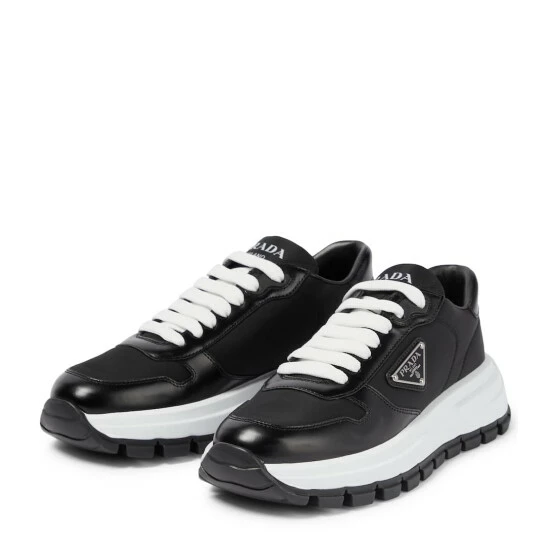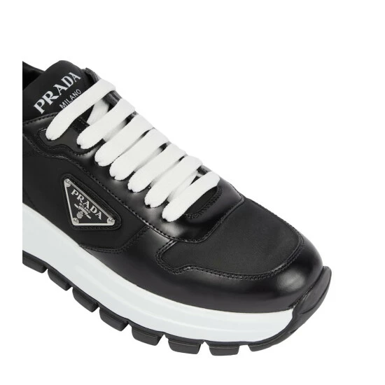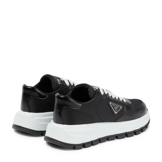 Prada updates the Prax 01 sneakers with nylon gabardine and leather paneling for the woman on the run. Enamel logo plaques at the sides leave no doubt about the pair’s origin.