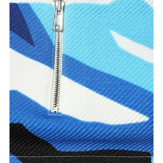 This cropped top from Prada works a bold blue-toned camouflage print and has an all-over puckered texture. The Italian-made piece features a round neckline, slim shoulder straps, and a silver-toned zip at the front, while it seals neatly with a concealed side zip.