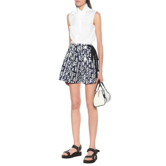 Allow nautical themes to permeate your summer wardrobe with these printed blue shorts from Prada. Made in Italy from structured cotton, this high-rise pair is defined by an elasticated waist, tie-side detail and a two-row button front. Wear yours with a sleeveless white shirt for a boardwalk stroll.