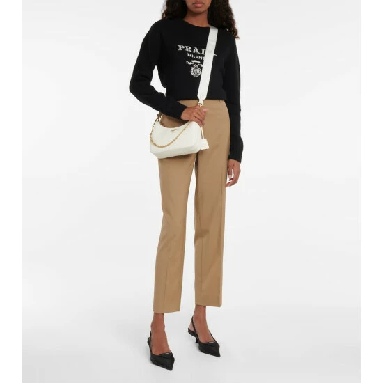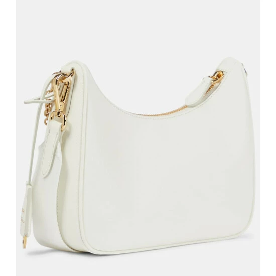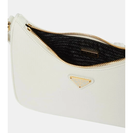 Prada’s Re-Edition shoulder bag reprises the house’s 2005 archival design in cross-hatched saffiano leather. The white style has a tuck-and-go baguette silhouette, detachable golden chain handle, and adjustable web strap. The removable pouch and keychain are practical features that Prada fans will love.