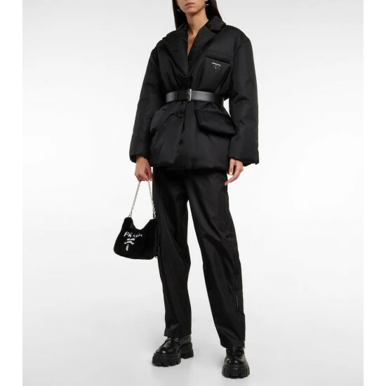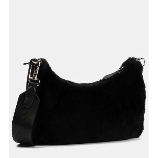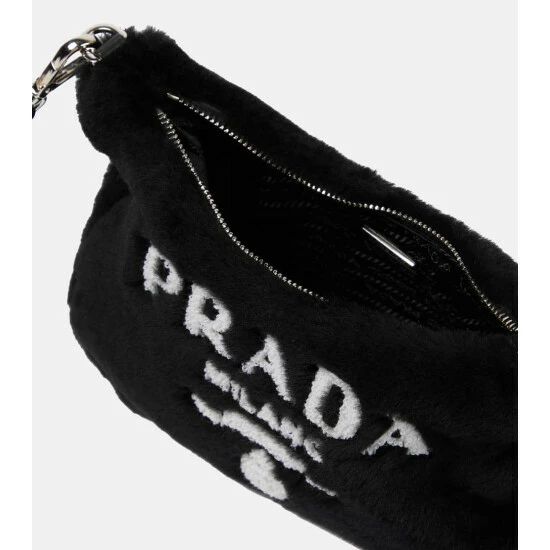 Prada’s Re-Edition shoulder bag reprises an archival 2005 design in black shearling. The branded baguette style has detachable chainlink and grosgrain straps for versatile carry, while the removable pouch and keychain are practical features that fans will love.