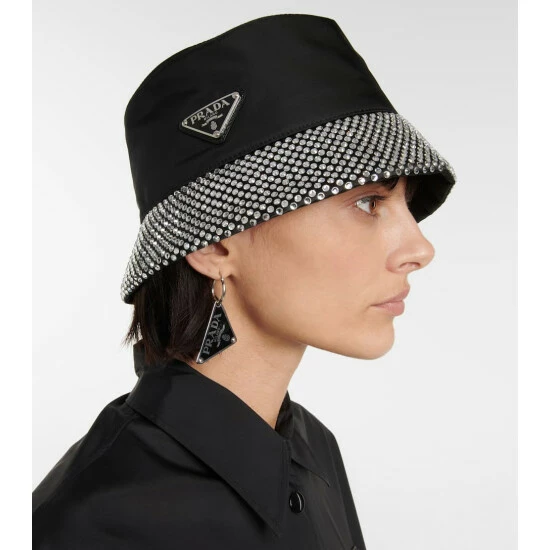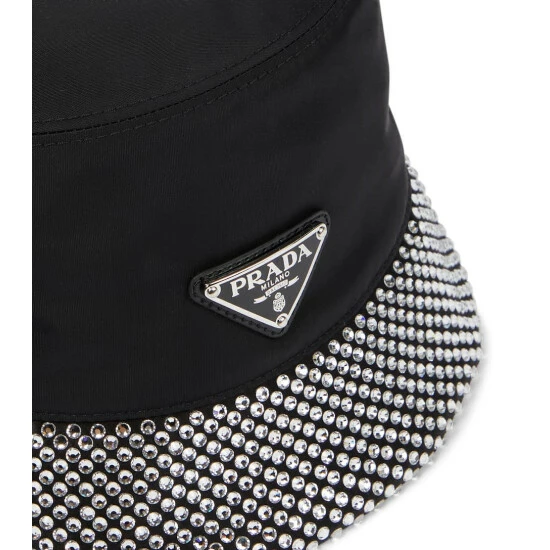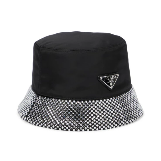 This Prada bucket hat is primed for day-to-dark styling. It’s made from Re-Nylon – derived from ocean waste – and encrusted with crystals along the brim. A triangular logo plaque lends instant recognition.