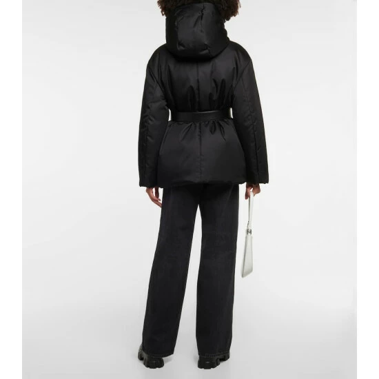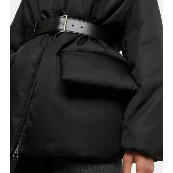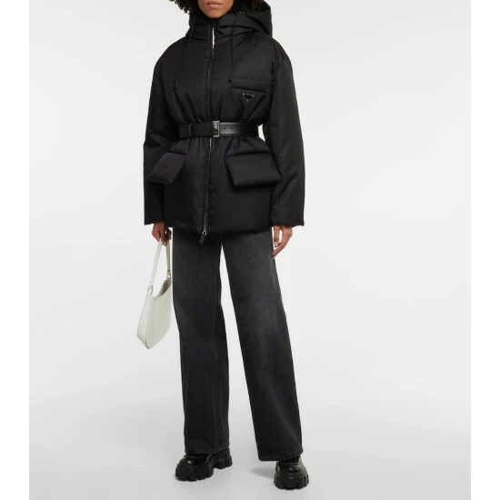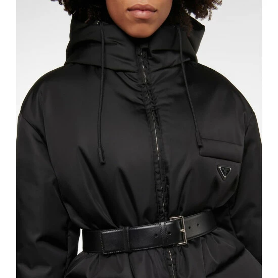 This Prada padded jacket is a timeless outerwear icon. It’s made from signature Re-Nylon gabardine, derived from ocean waste, and cinched with a leather belt. A rubberized triangular logo plaque lends recognition on every outing.