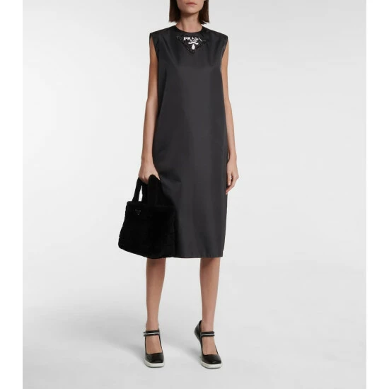 Prada designs clothes with the future in mind, as displayed by this black midi dress. Modern in cut and fabrication, it’s made from the label’s signature Re-Nylon gabardine, which uses regenerated nylon yarns, and it has a simple shift silhouette that’s free from adornment save an oversized logo at the neckline. Style over palazzo pants for fashion forward styling.