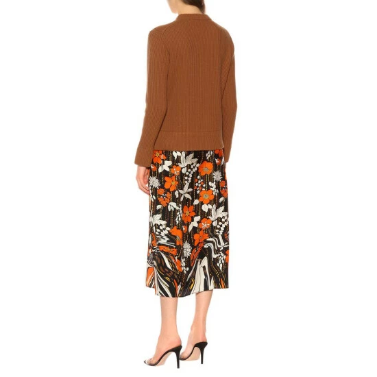 With a rubberized logo patch on the hip, working a graphically stylized version of the Prada logo, there’s something instantly striking about this sweater. The crew-neck piece has been spun from a sumptuous combination of wool and cashmere, with an all-over ribbed texture providing a little more tactile comfort. Let the warm brown colorway complement a rust-toned skirt.