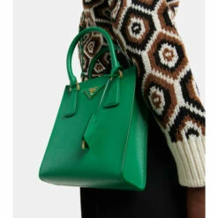 Chic and compact, this tote from Prada is crafted from the brand’s signature textured Saffiano leather in green. The style has a double handle, detachable shoulder strap, and the brand’s iconic triangle logo.