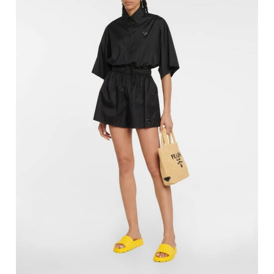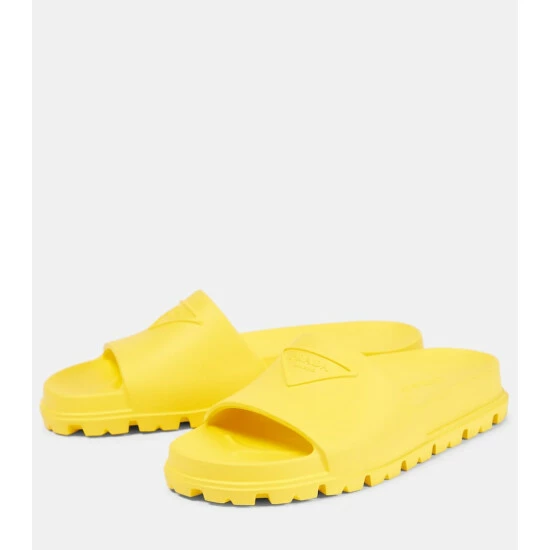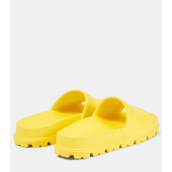 The Sandals Slider rubber slides from Prada are set on elevated track soles for a contemporary look. Embossed with the triangle logo, this yellow pair will add a pop of color to your pool ensembles.