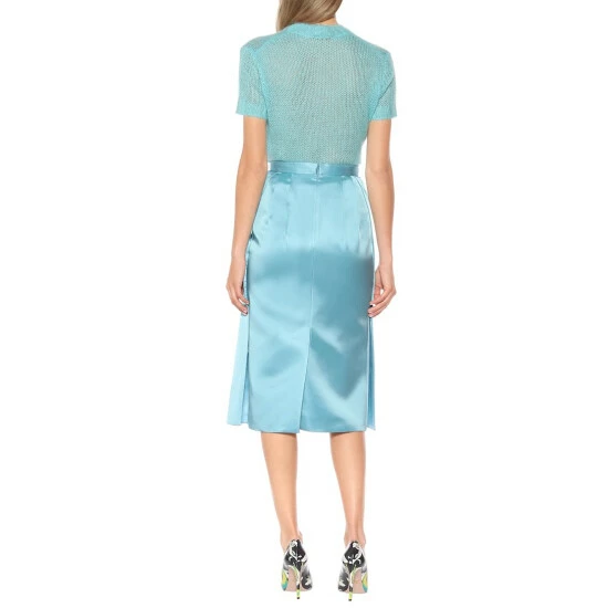 Rendered in a shining ice-blue hue, this midi skirt from Prada is sure to make an impact on your edit. The Italian-made design has been cut from silky satin into an A-line silhouette, which is finished with an inverted pleat for volume. Make yours the starting point of a modern cocktail ensemble, choosing a silk blouse and embellished pumps to complete your look.