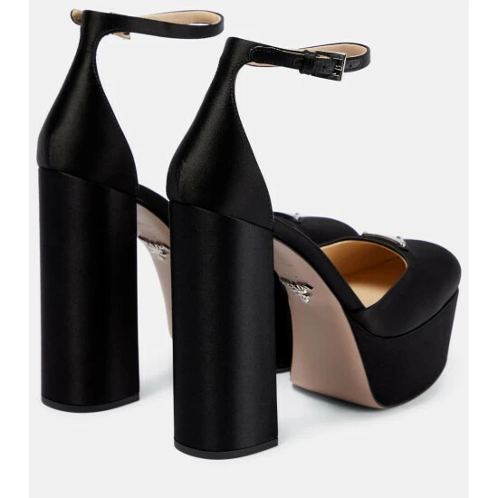Made from satin, these pumps from Prada are destined for decadent evening wear. The vertiginous style features platform soles and block heels, and is finished with triangular logo plaques atop the square toes.