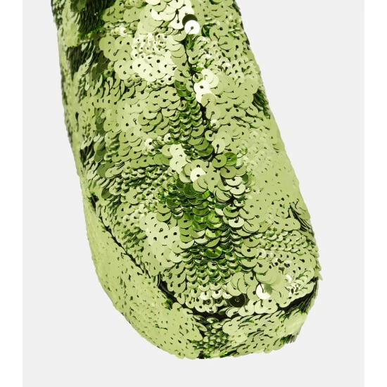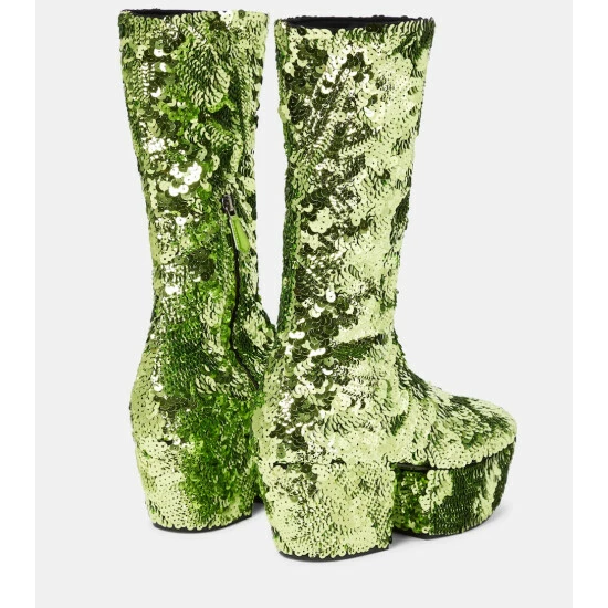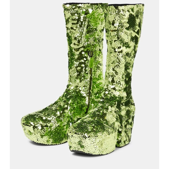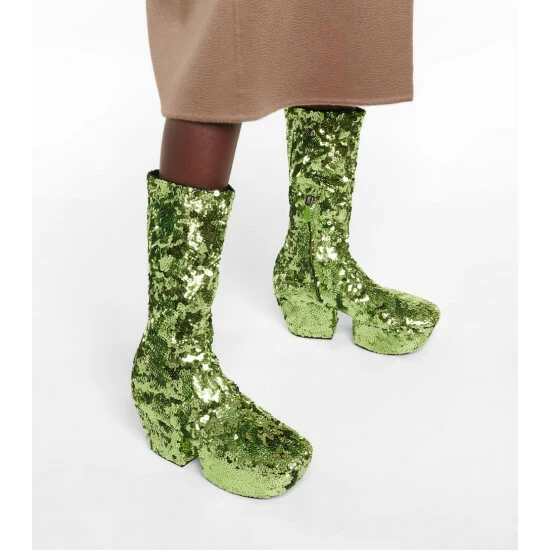 Hit the streets in runway style with these sequined green ankle boots from Prada. Set on heeled platform soles, they have square toes, sock-like uppers, and a side zipper fastening.