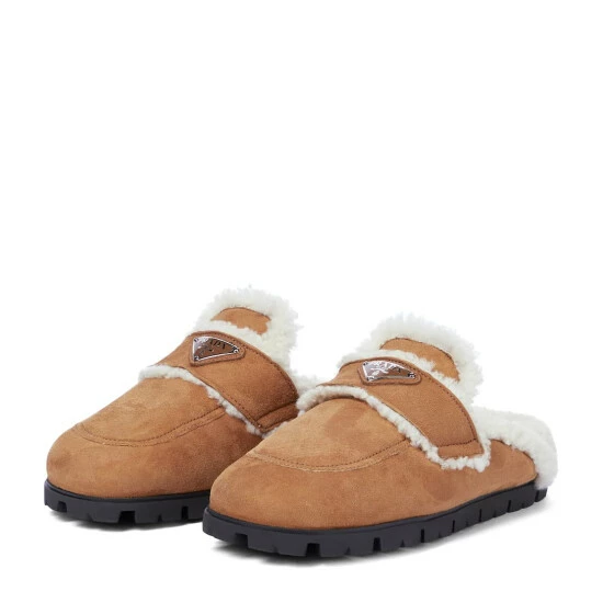 Luxurious staples are necessary for off-duty days, so opt for these shearling-lined slippers from Prada. Set on lugged rubber soles, they have brown suede crêpe uppers with enamel triangle logo plaques. Wear them with a Prada tracksuit around the home.