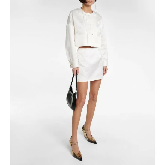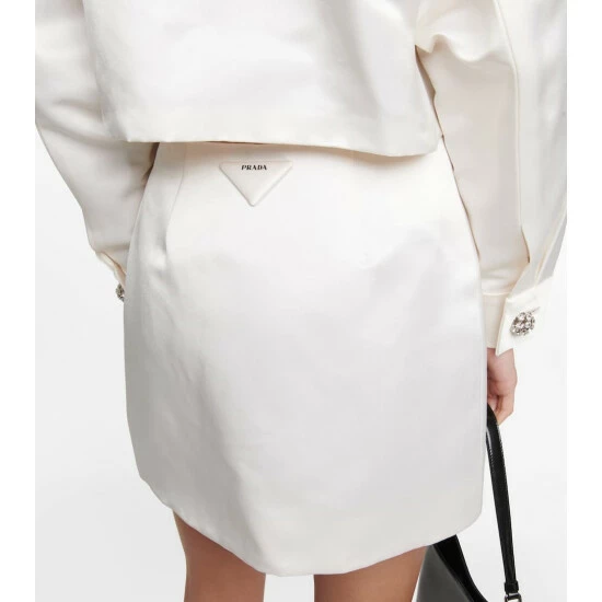 Prada takes mini hemlines to new heights with this A-line miniskirt. Made from lustrous pure silk satin, this style features darts at the waist for a seamless fit and has a three-dimensional triangle logo at the back.