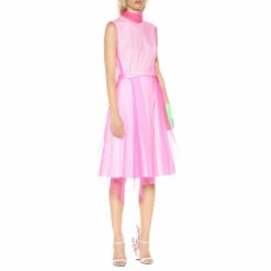 Prada’s latest runway collection featured glowing fluorescents contrasted with tweed and construction-inspired vests, with this tulle dress making its way into multiple looks. Made in Italy, this sleeveless style consists of one layer of sheer tulle along the bodice, draping into multiple layers at the skirt to create opacity. The neck ribbons can – and should – be tied into an extravagant bow. It also comes with a cotton pleated slip to wear underneath, but feel free to mix-and-match with leather corsets on top or brightly-colored dresses underneath.