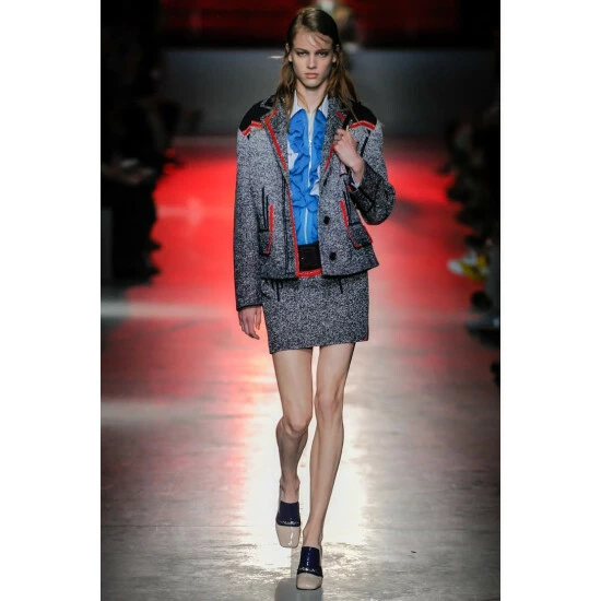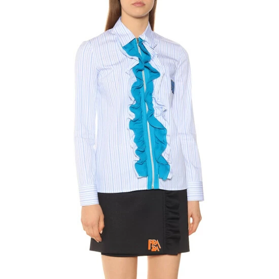 This striped shirt is not your average button-down, actually it isn’t a button down at all, instead it has a zip-front with teal ruching adorning it, a consistent look for Prada’s new season. Made in Italy from soft blue cotton, it has a classic shirting silhouette and updated details including a rubberized logo on the chest.