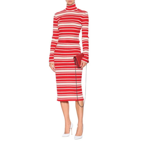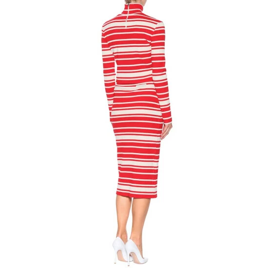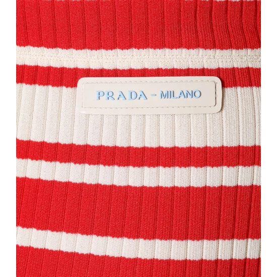 Crafted in Italy from ribbed knit in variegated off-white stripes against a red ground, this midi skirt from Prada captures the label’s artful sense of style. The tube design is fitted from the waist to hem, hugging the figure for a flattering silhouette. Wear yours with the matching sweater to emulate the brand’s inimitable aesthetic.