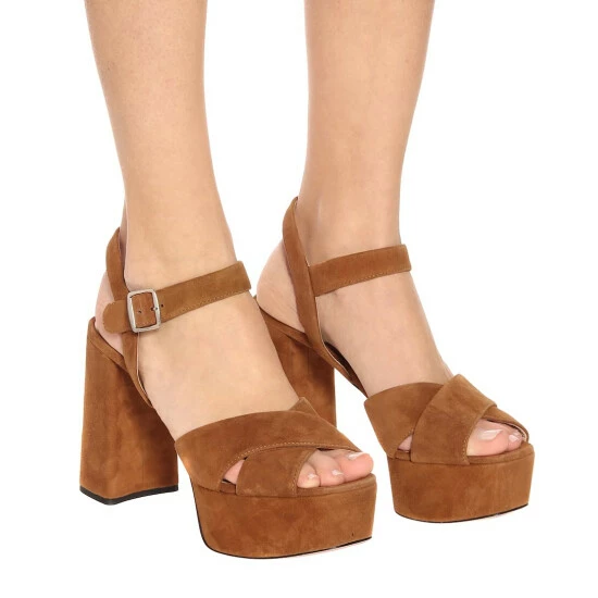 Elevate the everyday in Prada’s platform sandals. Set on sturdy 105mm block heels, its uplifting silhouette has been crafted in Italy from plush “Cinnamon” brown suede with cross-over straps and a silver-toned buckle. Wear yours after-dark with a minidress and shimmering accessories.
