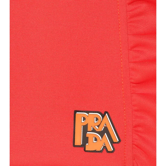 Crafted in Italy from the brand’s signature technical jersey, this SS19 runway-featured miniskirt from Prada features a buckled belt for adaptability. The design’s straight silhouette is juxtaposed with a flounced hem. We think the style’s playfulness is exaggerated with its vibrant orange base and coordinating rubberized logo appliqué.