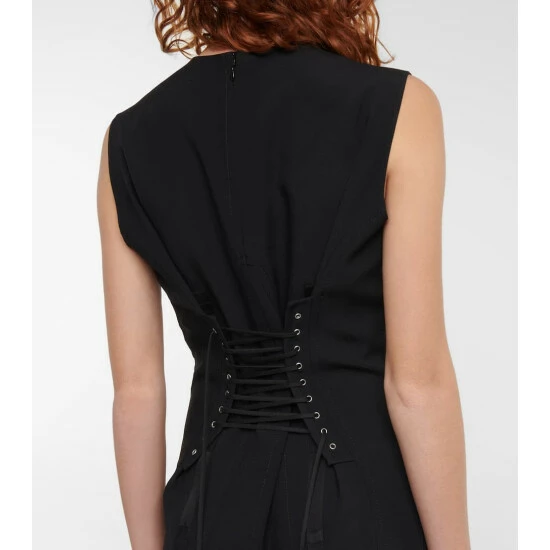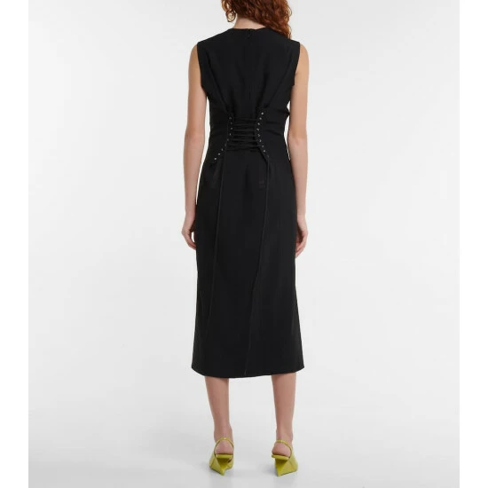 Classic tropes of feminine dressing, such as the corset-style fastenings on the midi dress, inspired Prada’s Spring/Summer offering. A sleeveless design, it has the label’s logo on the chest.