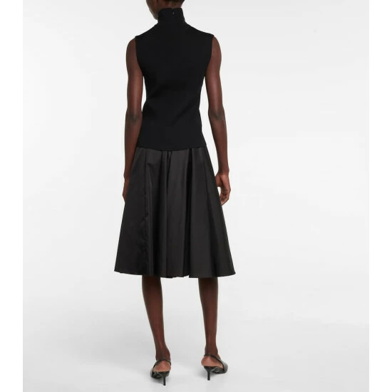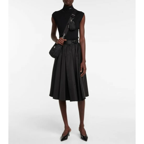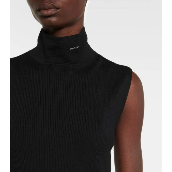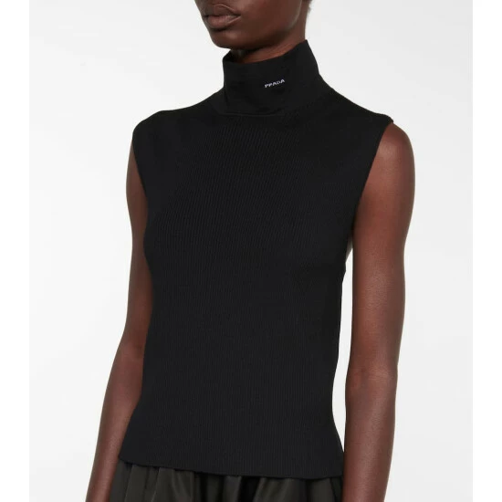 Cut a smart silhouette in this slender ribbed-knit black turtleneck top from Prada. Made from virgin wool, it’s sleeveless with minimalist logo detailing at the neck. Tuck yours into one of the label’s iconic nylon skirts.