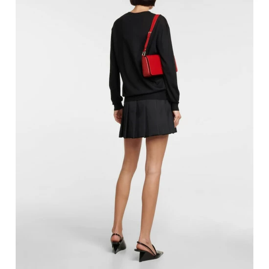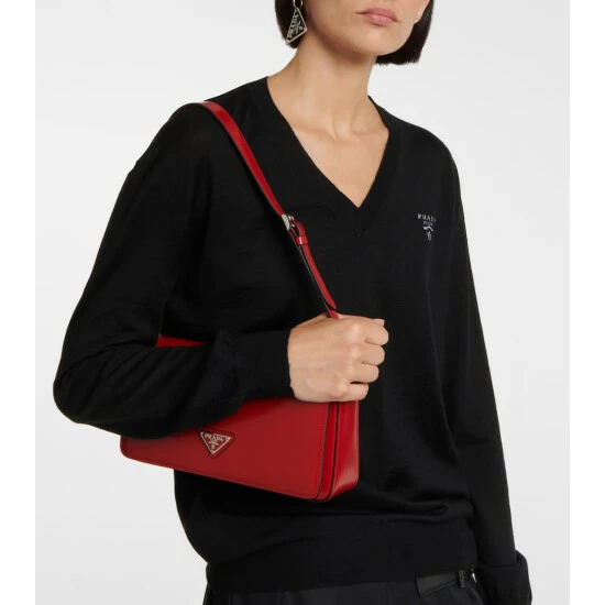 A study in minimalist elegance, this sweater from Prada has a v-neck and the label’s coveted logo on the chest.