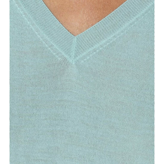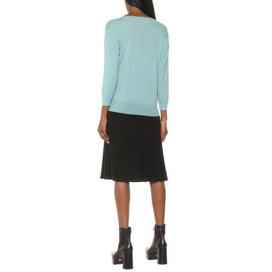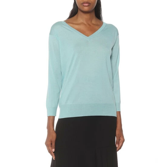 Prada crafts its V-neck sweater from featherweight virgin wool, making it perfect for transeasonal wear. This aquamarine-blue style has a relaxed fit with dropped shoulders, and is finished with heat-trapping ribbed trim. Style yours with white pants and golden jewelry.