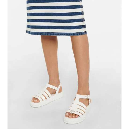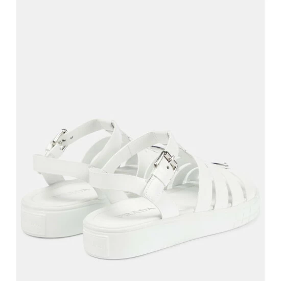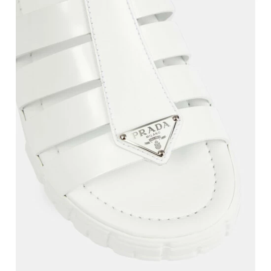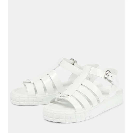 Prada’s Wheel sandals feature ridged rubber outsoles that reference motorcross tires. They’re made from smooth white leather with caged uppers, buckle fastenings and label-signature enamel logo plaques.