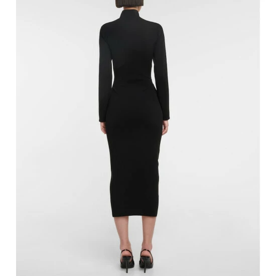 A zipped turtleneck, adorned with the triangular Prada logo plaque, brings a modern touch to this black midi dress. It’s a close-fitting design made from a soft wool blend.