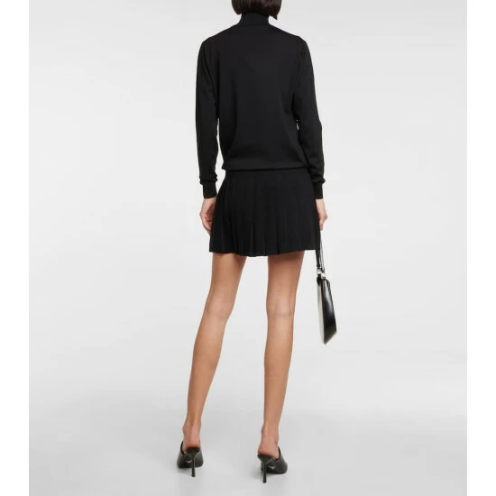 A study in minimalist elegance, this midi dress from Prada has a turtleneck and is made from a pure wool knit.